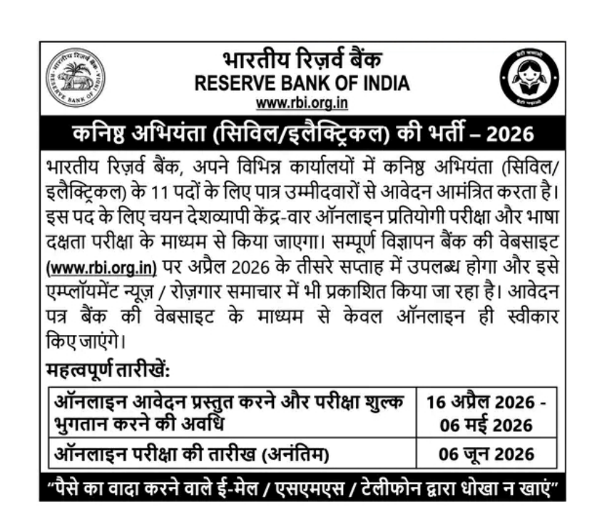 Name of Post : RBI Junior Engineer JE Recruitment 2026 Apply Online Form